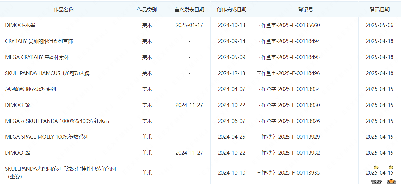 除了商标之外,美术作品著作权也是IP价值的初始起点,泡泡玛特已登记1500多件著作权。